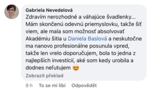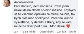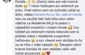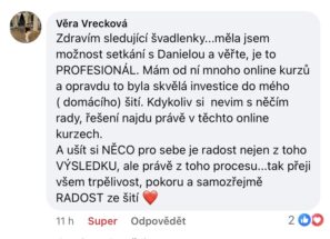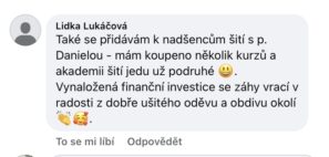 Sledovat Danieliny online kurzy šití, to je jako nahlížet pod ruku profesionálovi v řemesle při práci. Všechno je ukázáno dokonale názorně, do nejmenšího detailu, s perfektním komentářem, který je přesný a věcný. Je to něco úplně jiného než videa různých šijících amatérek v duchu "mikina za dvacet minut", které pro šití nejprve nadchnou a pak dokonale odradí, ale hlavně, že v nich je to srdíčko. S Danielou se poctivě a někdy pracně, krok za krokem učíte řemeslo; nadšení a láska k věci u ní nejsou ve slovech, ale v nekompromisní náročnosti k sobě samé. Pokud chcete šít technologicky správně, precizně a s krásným výsledkem a pokud dokážete šití obětovat čas a úsilí, které si zaslouží, jsou její online kurzy to pravé. I díky nim se ve svých šestapadesáti konečně oblékám tak, jak chci, moje osmdesátiletá maminka má nejlepší šatník ve svém životě a manžel mě "uhání" o další kalhoty, protože ty ode mě jsou prostě nej..
